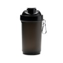 Shaker de PP con agitador de acero inoxidable 304. Dosificador en PP y compartimentos para suplementos. Capacidad 600 ml. Incluye mosquetón.