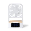 Ventilador de escritorio elaborado en ABS reciclado y superficie de la base en bambú. Con 3 velocidades, plegable, con botones multifunción de control y función reloj. Cuenta con un puerto de salida USB A y dos puertos Tipo C de entrada y salida. Con cargador inalámbrico con potencia de 15W. Cable tipo C incluido. Presentación en caja diseño eco.