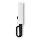 Paraguas plegable realizado en RPET con apertura y cierre automático. Tejido pongee 190T. Varillas de fibra de vidrio con sistema antiventisca y mango mosquetón integrado. Cierre de velcro. Incluye funda a juego.