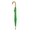 Paraguas con mango, bastón y terminaciones en madera. Varillas en negro. Cierre con velcro en color a juego con la tela del paraguas. Apertura manual. Diámetro 105.