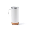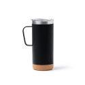 Taza de acero inoxidable reciclado de doble pared con base de corcho y tapa de seguridad transparente. Capacidad de 600 ml.
