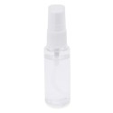 Botella de gel hidroalcohólico de 30 ml con dosificador spray. Transparente de forma redonda con capucha blanca.