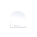 Trofeo de cristal de diseño circular con base rectangular. Incluye estuche de presentación en color negro.