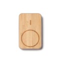 Batería externa de 5000 mAh con cuerpo de bambú y fibra de trigo. Con cargador magnético en la superficie para carga inalámbrica de dispositivos provistos de esta tecnología. Cuenta con soporte para smartphone en la parte trasera y cable tipo C integrado. Con indicador luminoso. Incluye cable Tipo C. Presentación en caja diseño eco.