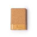 Batería externa recargable de 5000 mAh realizada en corcho y bambú. Con puerto Tipo C de entrada y salida y puerto USB de salida. Cuenta con indicador luminoso de estado de la batería.