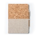 Bloc de notas A5 con tapas rígidas de corcho y algodón. 80 hojas lisas. Incluye soporte con bolígrafo de corcho y fibra de trigo a juego.