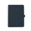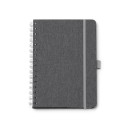 Libreta A5 de portada rígida elaborada con tejido poliéster reciclado RPET y con espiral doble. Incluye banda elástica de cierre y soporte para bolígrafo a juego con la portada. Contiene 80 hojas a rayas, perfecta para notas organizadas y ecológicas.