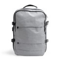 Mochila de viaje realziada en poliéster reciclado RPET, diseñada para comodidad y funcionalidad. Cuenta con espalda y asas acolchadas, 2 bolsillos exteriores frontales y 3 amplios compartimentos principales. Incluye un compartimento acolchado para portátil de 17,3", salida USB con cable micro USB para conectar un Power Bank (no incluido), y un compartimento transpirable para zapatillas. Con bolsillo antirrobo en la parte trasera y cinta para trolley, ofrece una capacidad de 30 litros para viajes organizados y seguros.