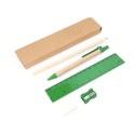 Set de 5 piezas. Incluye bolígrafo con cuerpo de cartón y tinta azul, lápiz de madera, sacapuntas, goma y regla de 15 cm.