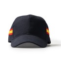 Gorra de 6 paneles 100% algodón peinado con diseño de bandera nacional. Cierre ajustable de velcro y orificios de ventilación.