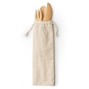 Set de cubiertos de bambú presentados en funda de algodón natural con cordón autocierre. Incluye tenedor, cuchillo y cuchara. Perfectos para personalizar y promocionar tu negocio.