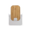 Cargador inalámbrico plegable, con cuerpo elaborado en fibra de trigo y superficie de carga en bambú. Con soporte multiposición para situar el smartphone tanto en vertical como en horizontal. Con potencia de carga de 10W. Compatible con dispositivos que admiten tecnología inalámbrica. Cuenta con puerto de entrada Tipo C de conexión. Cable Tipo C incluido. Presentación en caja diseño eco.