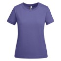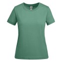 Camiseta gruesa de mujer en manga corta de algodón. Cuello redondo y ribete mangas en canalé ancho 2x1. Cubrecosturas reforzado en cuello. Costuras laterales. Logo Roly a tono en bajo lateral izquierdo. Costura ancha en el bajo.