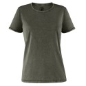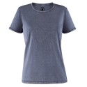 Camiseta de manga corta efecto jeans para mujer. Cuello fino redondo en canalé 1x1 con cubrecosturas de refuerzo de hombro a hombro. Doble costura en sisas. Apertura de manga con dobladillo.