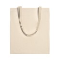 Bolsa fabricada en tejido de algodón en color natural, con asa larga de cinta en el mismo color.