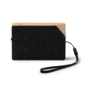 Altavoz inalámbrico con superficie de poliéster reciclado RPET y cuerpo de bambú, con 3W de potencia. Con batería recargable de Litio con cable y carga solar situada en la parte posterior. Incluye asa de transporte en el lateral y entrada Tipo C. Diseño rectangular con detalle triangular en una de las esquinas. Incluye indicador LED de carga, y botón de encendido y apagado para reproducción y pausa de la música.