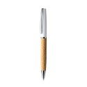 Bolígrafo promocional giratorio con cuerpo elaborado en corcho natural y metal con detalles cromados. Tinta azul.