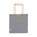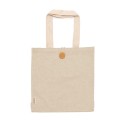 Bolsa de algodón reciclado con acabado jaspeado. Asas largas reforzadas de 70 cm. Cierre con botón.