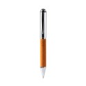Bolígrafo giratorio con cuerpo realizado en metal y piel reciclada. Tinta azul.