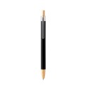 Bolígrafo con cuerpo metálico de tacto suave con pulsador y punta elaborados en bambú. Con detalle transparente. Tinta azul.