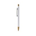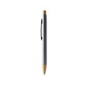 Bolígrafo métalico de acabado goma con pulsador y detalles en bambú, ofreciendo un diseño natural y sostenible. El clip cromado añade un toque de elegancia y funcionalidad. Carga jumbo de tinta azul .